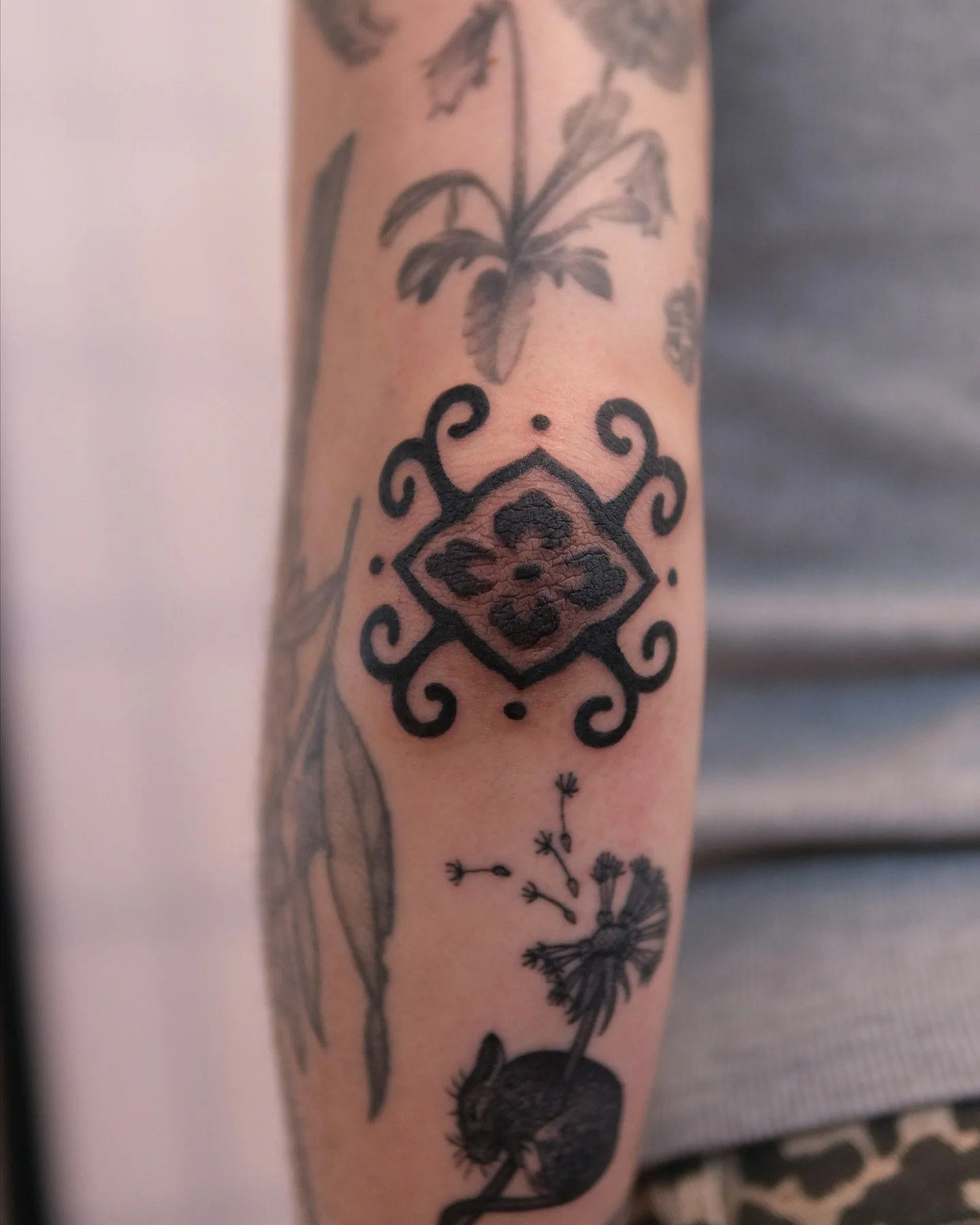 View fullsize Matching elbow ornaments for the toughest Bella πŸ–€ Thanks so much for sitting so well for these 😡 I’d love to do more ornament tatts!
