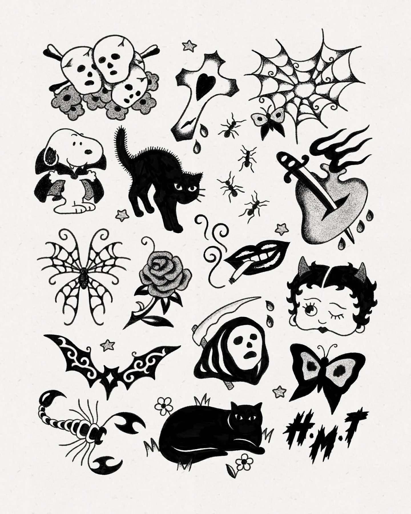 View fullsize My flash sheet for the upcoming @hiddenmoontattoo Halloween Flash Day on Saturday 25 October πŸ–€ Priced between $150-$250 • Arms and legs only • 11am til late πŸ–€ Can’t wait!